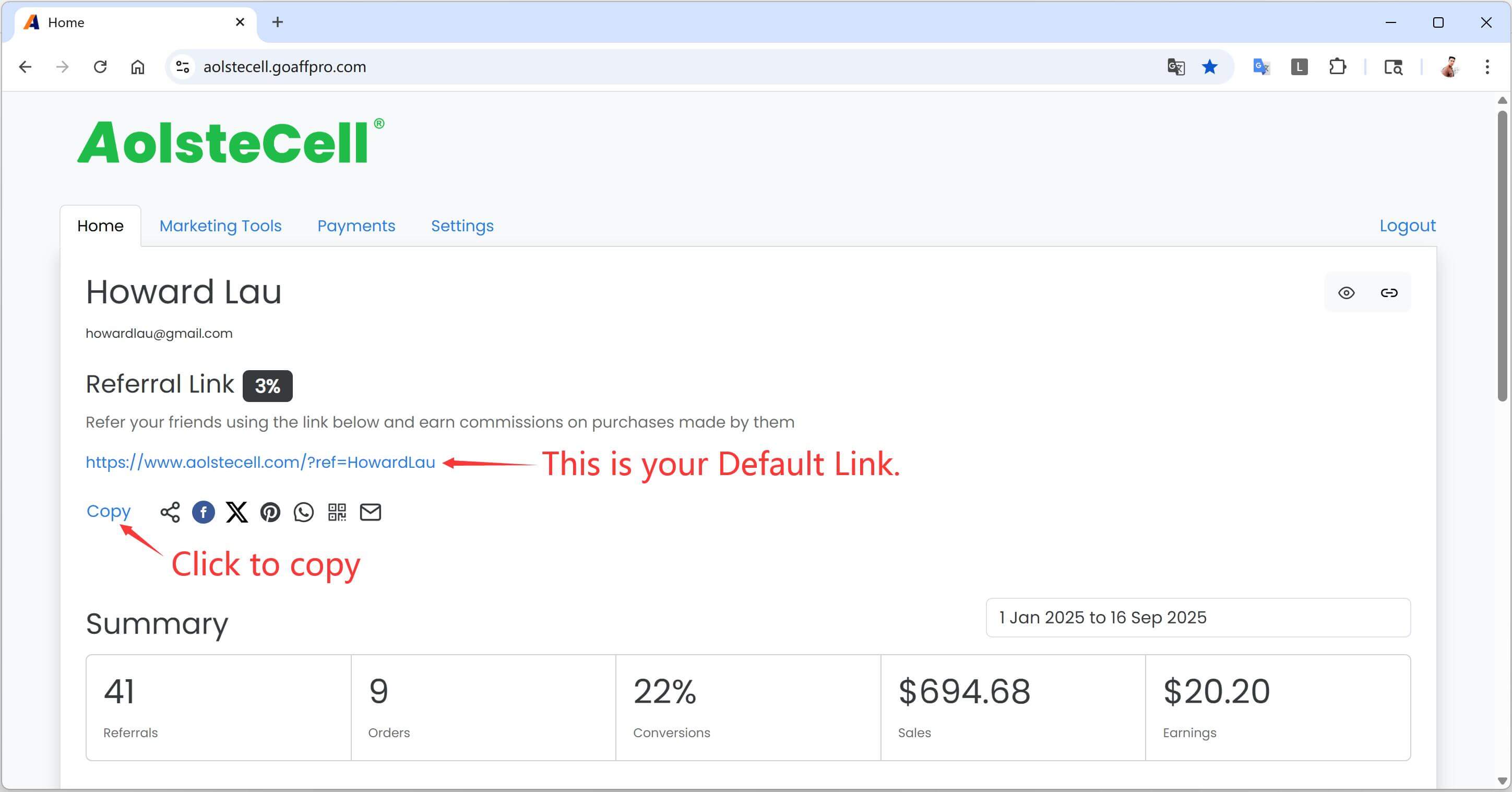 💡 Tip: Your unique affiliate link is usually based on the name you filled in when registering, and cannot be modified. If you need to modify it, for example, if your name is too long, you can contact