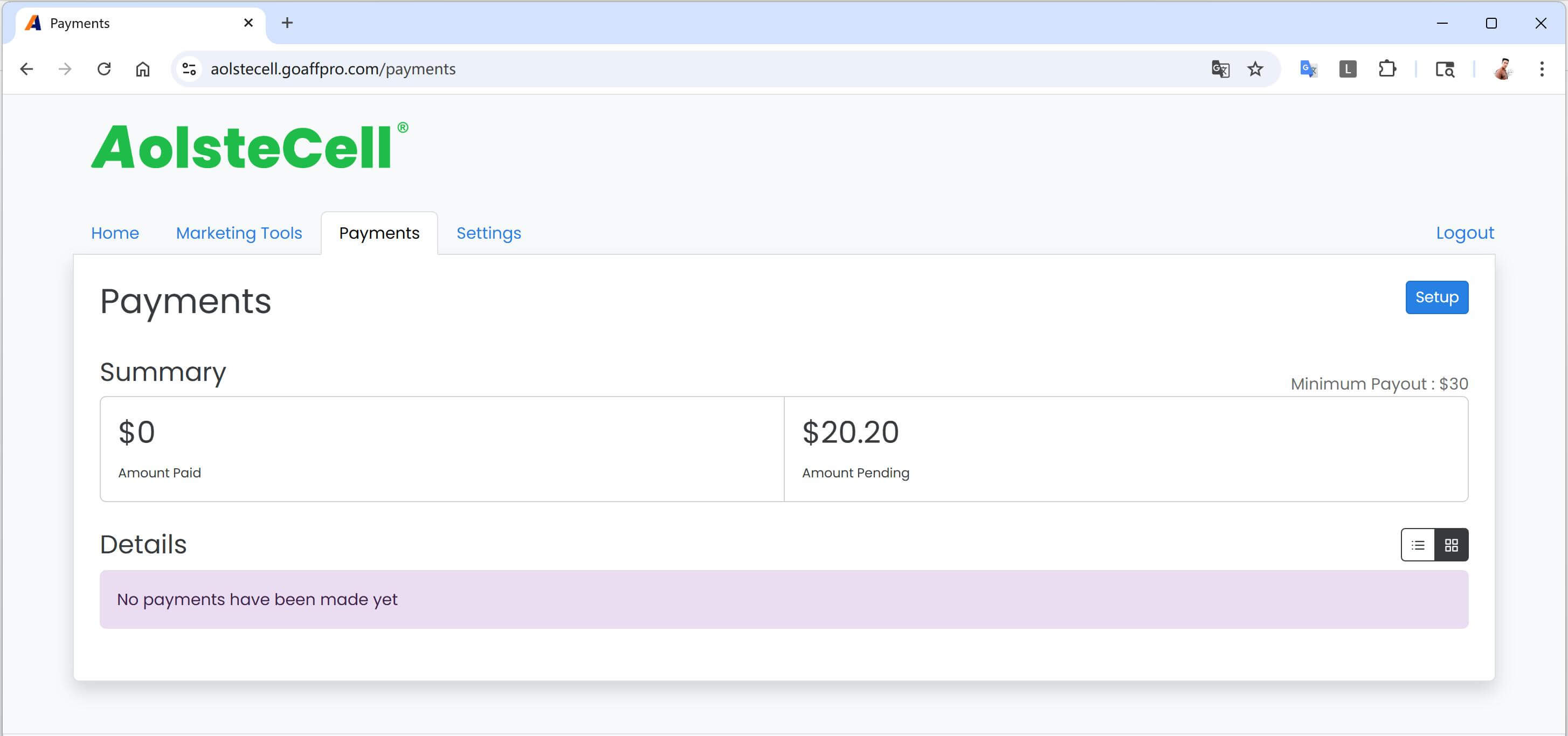 The minimum payout threshold is US$30. If your commissions are below this amount, they will roll over to the next month until the threshold is reached.